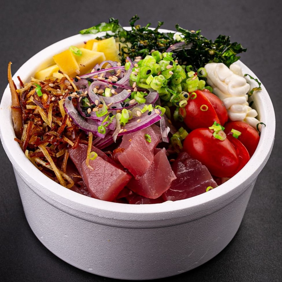 Arroz,atum em cubos,shimeji,sunomonu,manga,tomate cereja,cebola roxa,batata frita,couve frita,cebolinha,gengibre,cream cheese,genilim. Não alteramos itens.