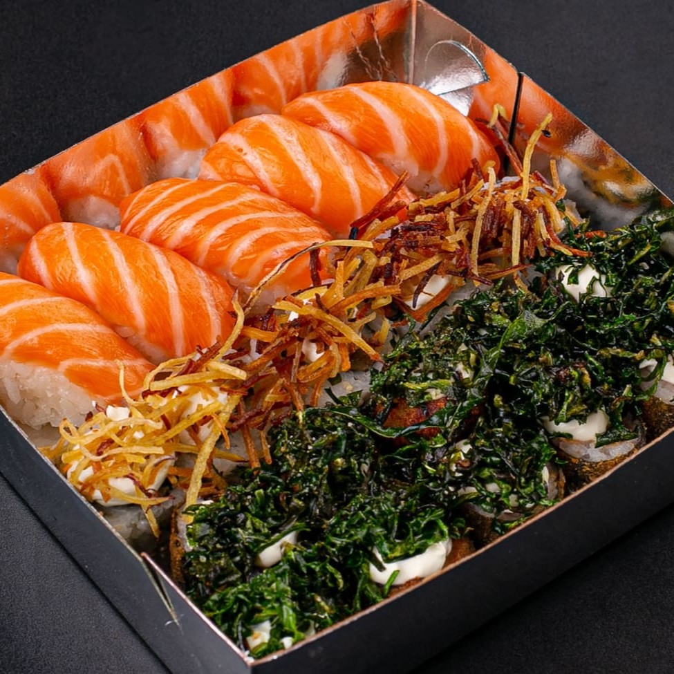 Descubra a delicadeza e a explosão de sabores do nosso combo promocional, composto por 10 hot rolls crocantes, envoltos por uma deliciosa camada de couve crispy. Acompanha 5 niguiris de salmão, frescos e suculentos, que derretem na boca. E para completar, saboreie 5 uramakis Filadélfia, recheados com cream cheese e envoltos por batata crispy, que proporcionam uma experiência gastronômica única e irresistível. Este é um prato perfeito para os amantes da culinária japonesa que procuram por uma combinação de sabores autênticos e texturas incríveis.