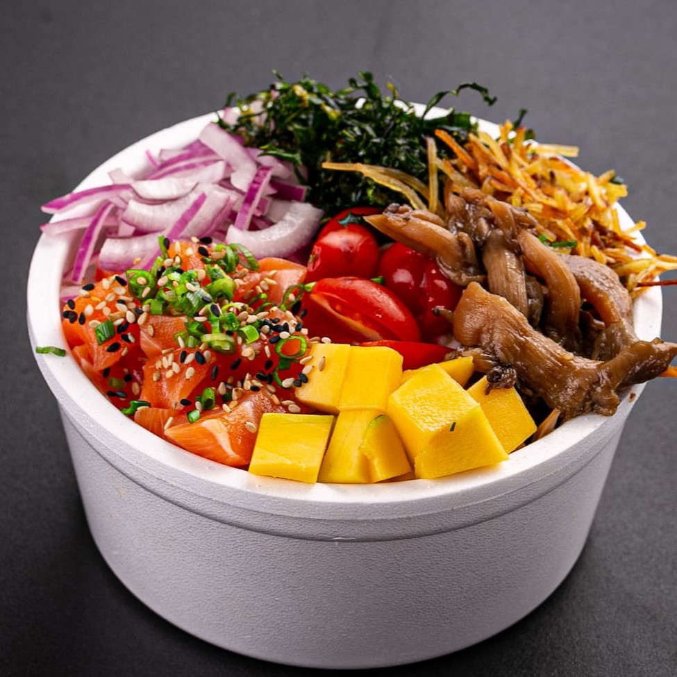 Shari (arroz japones), salmão em cubos, shimeji, manga, morango, tomate cereja, cebola roxa, batata crispy , couve crispty, alho poro ,cebolinha, cream cheese e gergilim . Não alteramos itens, caso queira retiramos algum item, somente.