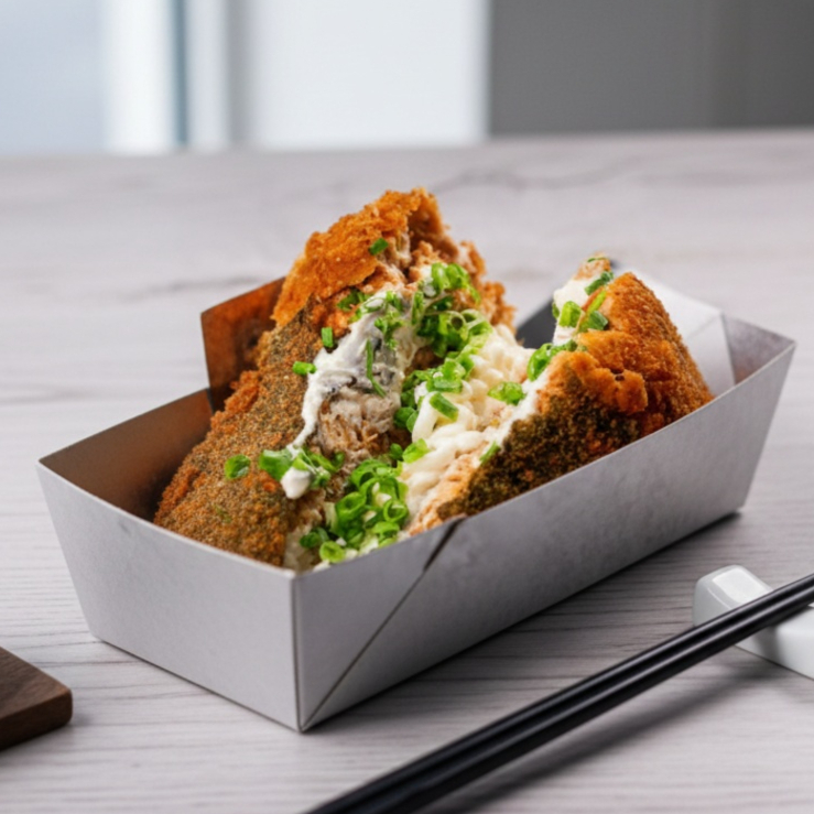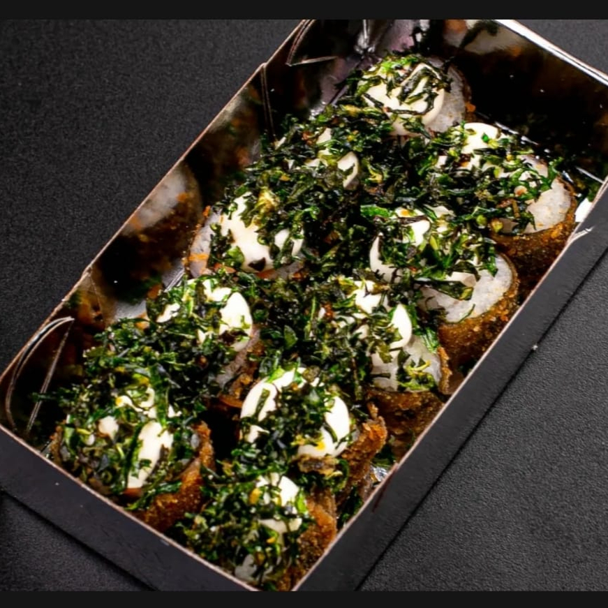 Leve, crocante e cheio de sabor! Feito com suculentos pedaços de kani kama misturados a um cremoso refogado com temperos especiais,