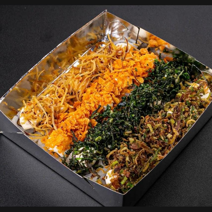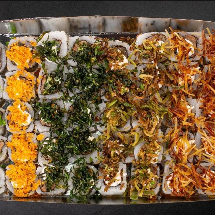 5 uramaki com Doritos, 5 uramaki com couve crispy, 5 uramaki com batata crispy, 5 uramaki com cream cheese e cebolinha