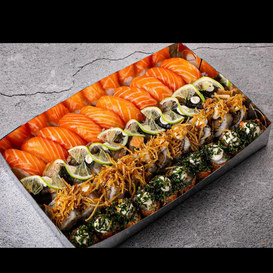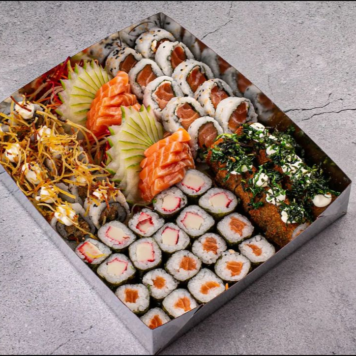 20 salmomaki, 20 hot holl com couve crispy, 20 uramaki filadelfia com batata crispy, 20 kanimaki, 20 uramaki de salmão, 16 sashimi de salmão