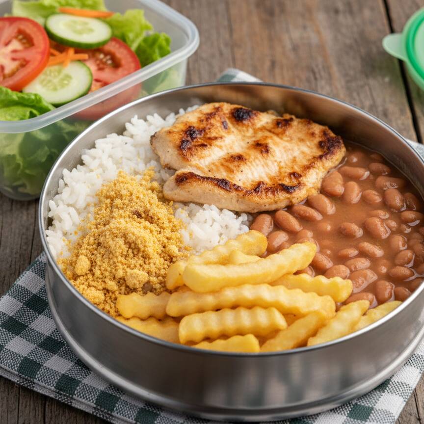 Aproximadamente 350 Gramas. Filé de frango grelhado com arroz, feijão, farofa, salada de alface e cebola e batata frita. IMAGEM ILUSTRATIVA.
