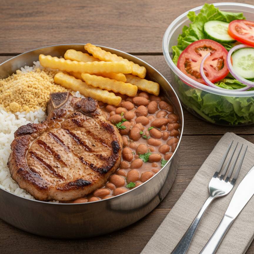 Aproximadamente 350 Gramas. Bisteca suína grelhada com arroz, feijão, farofa, salada de alface e cebola de alface e cebola e batata frita. IMAGEM ILUSTRATIVA.