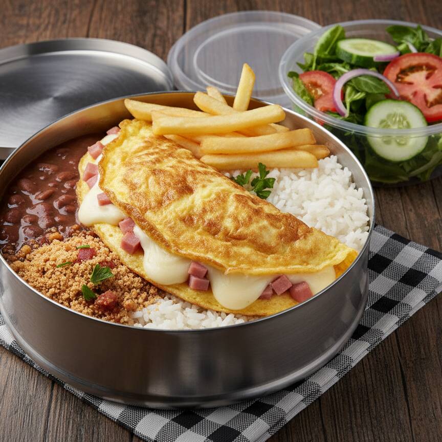 Aproximadamente 600 Gramas. Omelete bem recheado, acompanhado com arroz, feijão, farofa, salada de alface e cebola e batata frita. IMAGEM ILUSTRATIVA.