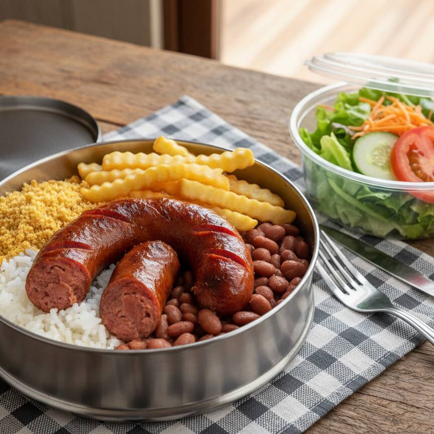 Aproximadamente 600 Gramas. Linguiça toscana servida com arroz, feijão, farofa, salada de alface e cebola e batata frita. IMAGEM ILUSTRATIVA.