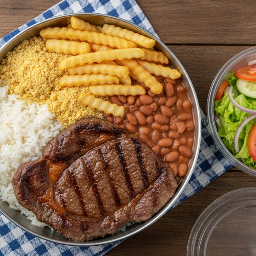 Aproximadamente 600 Gramas. Contra filé grelhado acompanhado de arroz, feijão, farofa, salada de alface e cebola e batata frita. IMAGEM ILUSTRATIVA. Acompanha Refrigerante Lata.