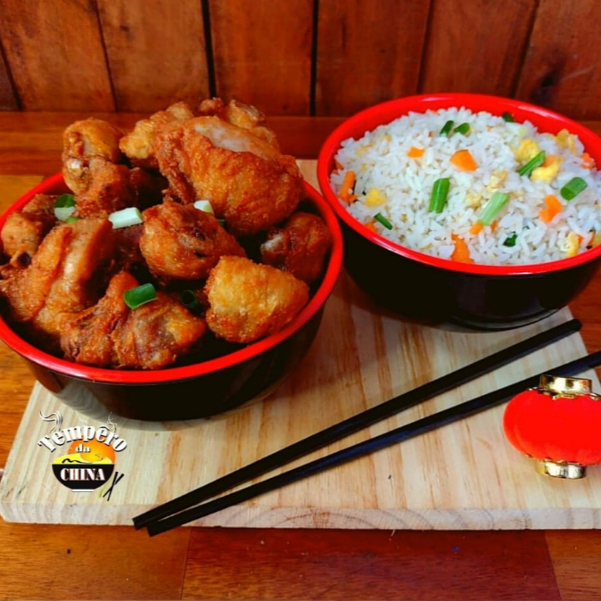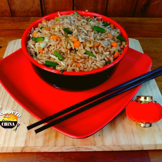Arroz chinês, frango desfiado, ovos mexidos, cebola, pimentão, gengibre, cenoura e cebolinha picados e temperados ao toque especial do chefe