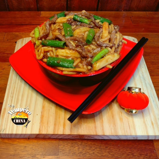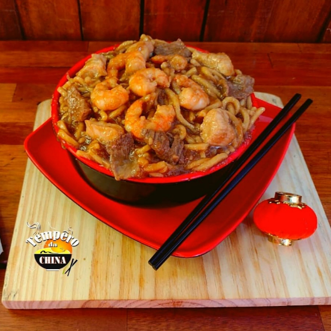Um delicioso macarrão chinês, refogado ao molho shoyu com batata frita, legumes temperados ao toque especial do chefe