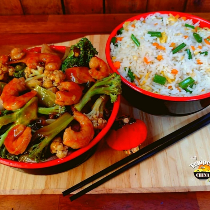 Porção de camarão com legumes, acompanhados de arroz yakimeshi