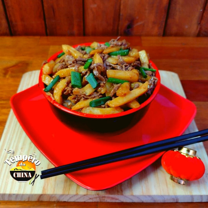 Deliciosa porção de batata frita, refogada com carne fatiada ao molho shoyu e cebolinha