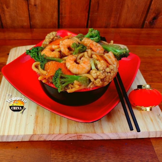 Um delicioso macarrão chinês, refogado com legumes temperados ao toque especial do chefe