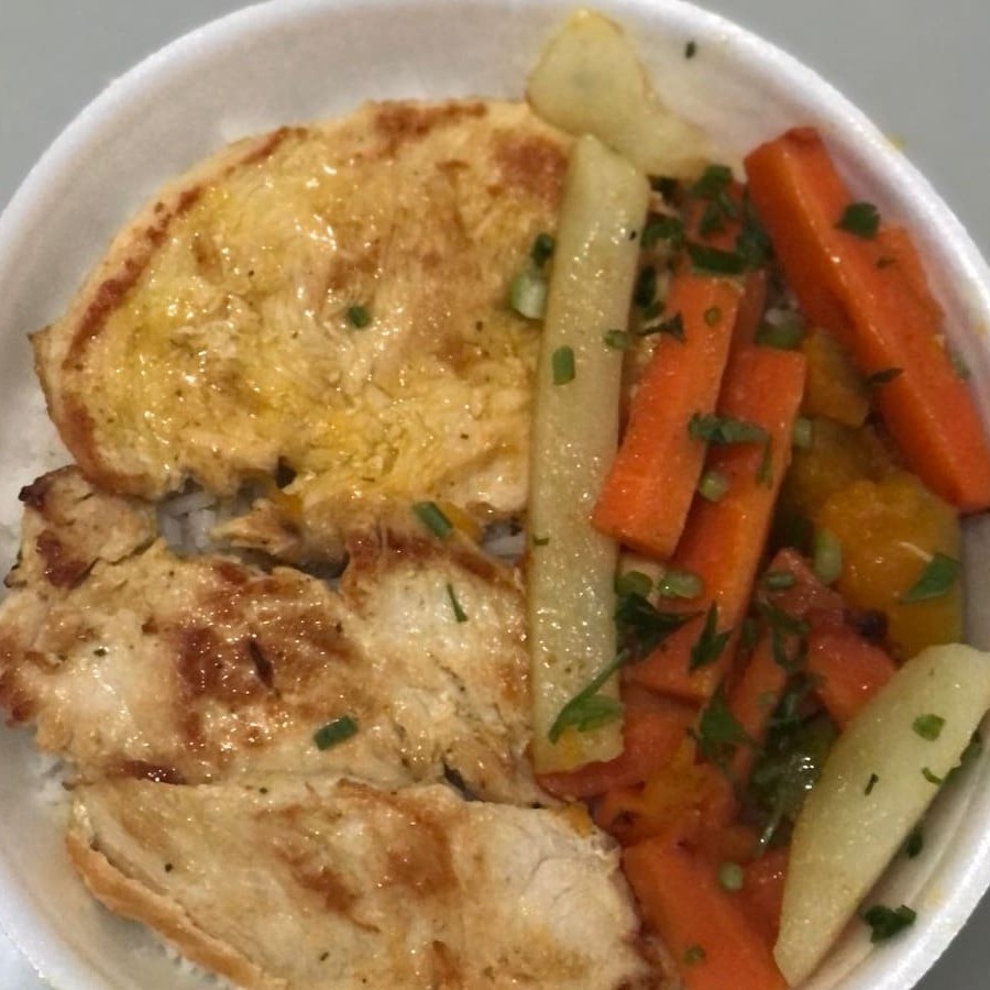 Marmita com arroz soltinho, feijão com caldinho, filé de frango grelhado ao fio de azeite, acompanha mix de legumes frescos, refogados em manteiga. marmita, almoço, filé, carne, frango, parmegiana, entrega gratis