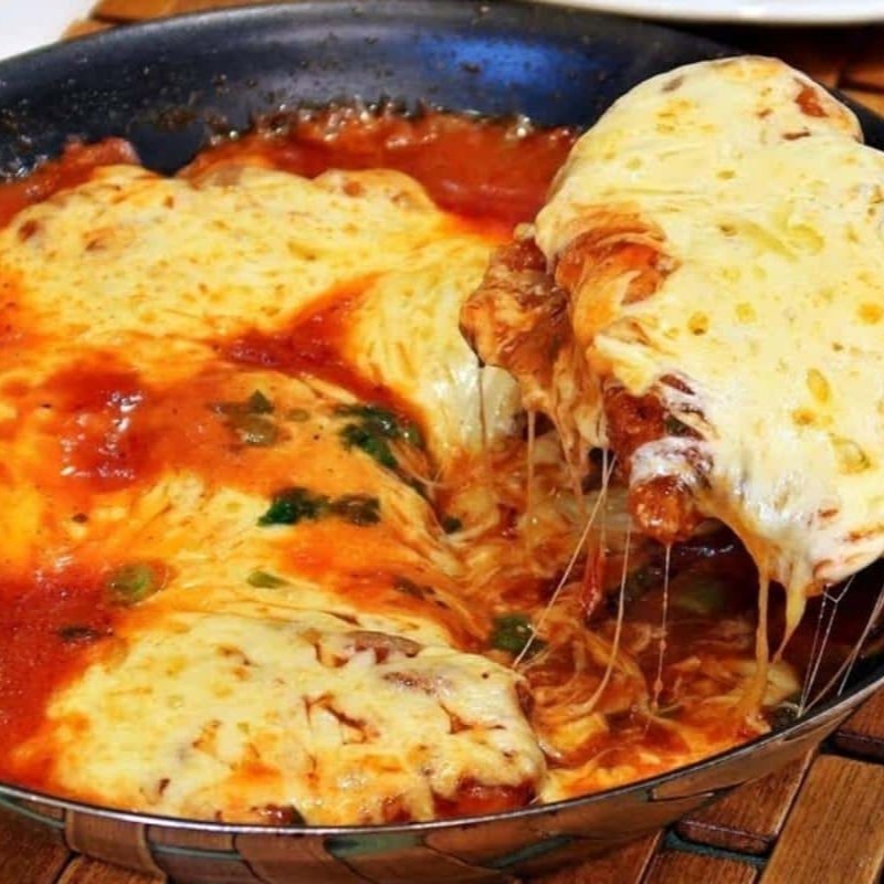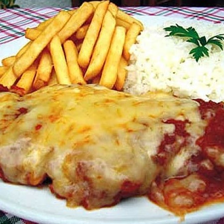 Arroz soltinho, feijão com caldinho, filé de frango de respeito, empanado em 2 farinhas, parmegiana caprichada com fatias de queijo extra (muito queijudo), e o molho bem temperado.