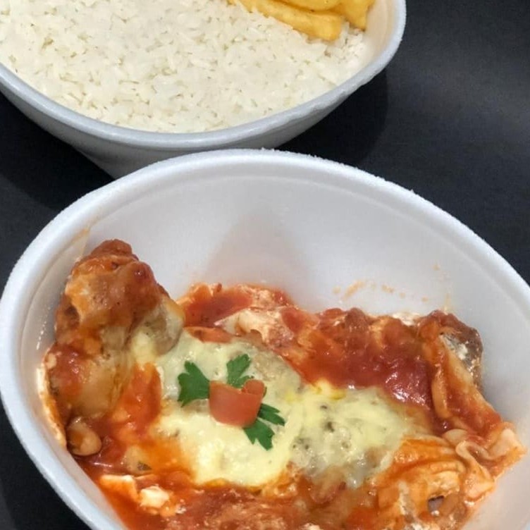 Parmegiana de contra filé com molho temperado, fatias generosas de queijo, acompanhado de arroz soltinho e fritas crocantes, a Chef caprichou no Tempero. marmita, almoço, filé, carne, frango, parmegiana, entrega gratis