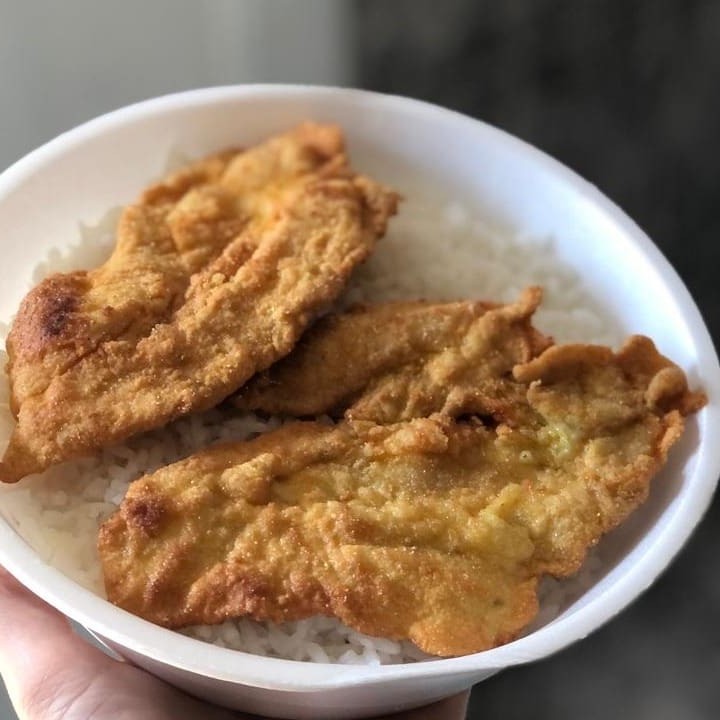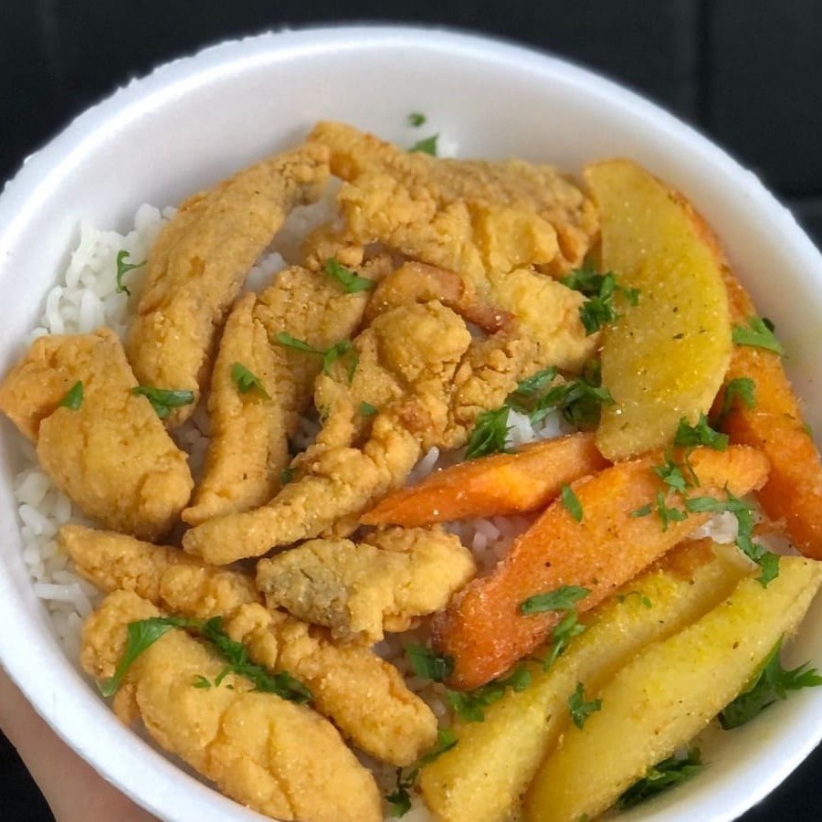 Isca de Peixe + Fritas. Este prato individual é uma refeição completa e saborosa, composta por um arroz extremamente soltinho e umedecido na medida certa. As iscas de peixe, cuidadosamente selecionadas, passam por um processo de empanamento leve que resulta numa textura irresistivelmente crocante. Para finalizar, tenha o prazer de saborear nossas fritas, igualmente crocantes. marmita, almoço, filé, carne, frango, parmegiana, entrega gratis