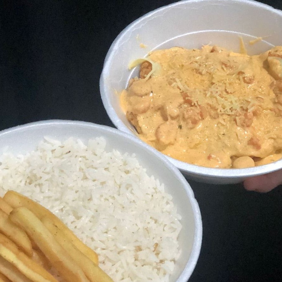 Strogonoff de frango bem temperado, acompanha arroz e fritas marmita, almoço, filé, carne, frango, parmegiana, entrega gratis