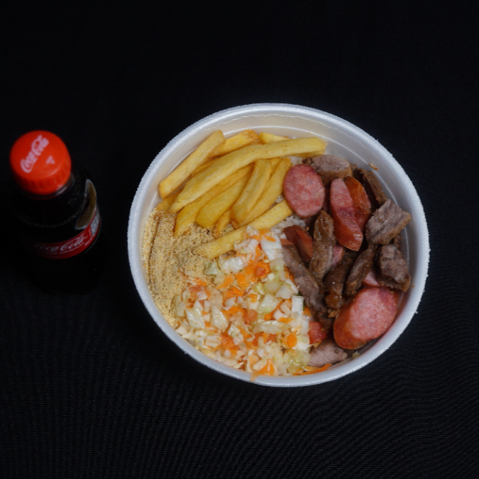 Arroz soltinho, feijão com caldinho, toscana tripla, tostadinha, com aquele sabor de churrasco, acompanha fritas e saladinha.