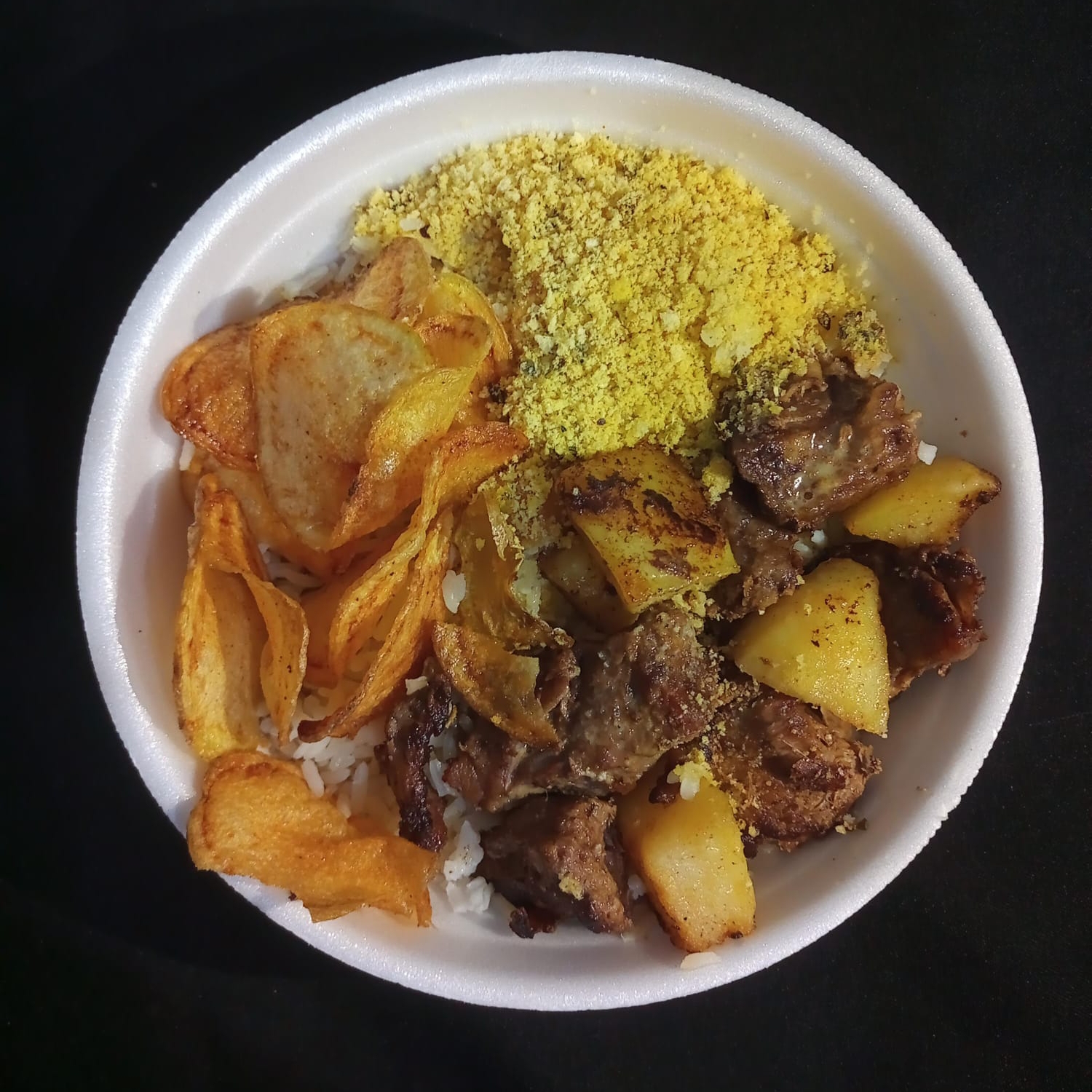 arroz branco, feijão carioca e deliciosos pedaços de costela c/ especiarias, farofa e batata chips.