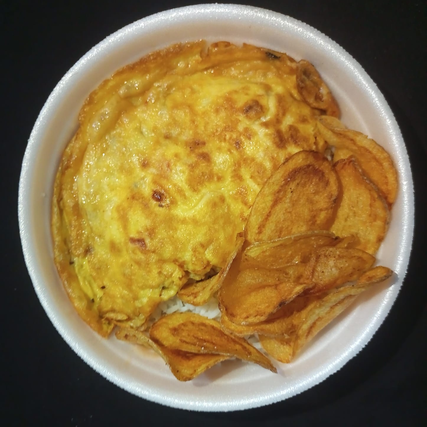 arroz branco, e feijão carioca e um delicioso omelete, guarnição de batata chips