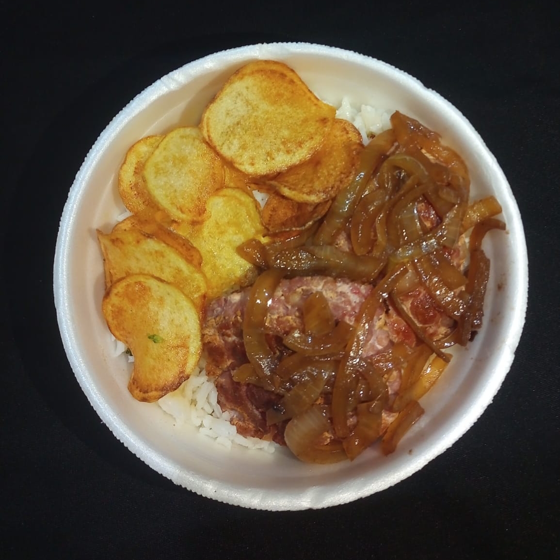 arroz branco e feijão carioca, linguiça grelhada c/ cebola, guarnição de batata chips