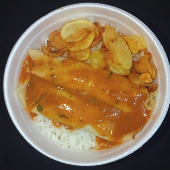 arroz branco, feijão carioca e 2 unidades de panquecas de carne, guarnição de batata chips.