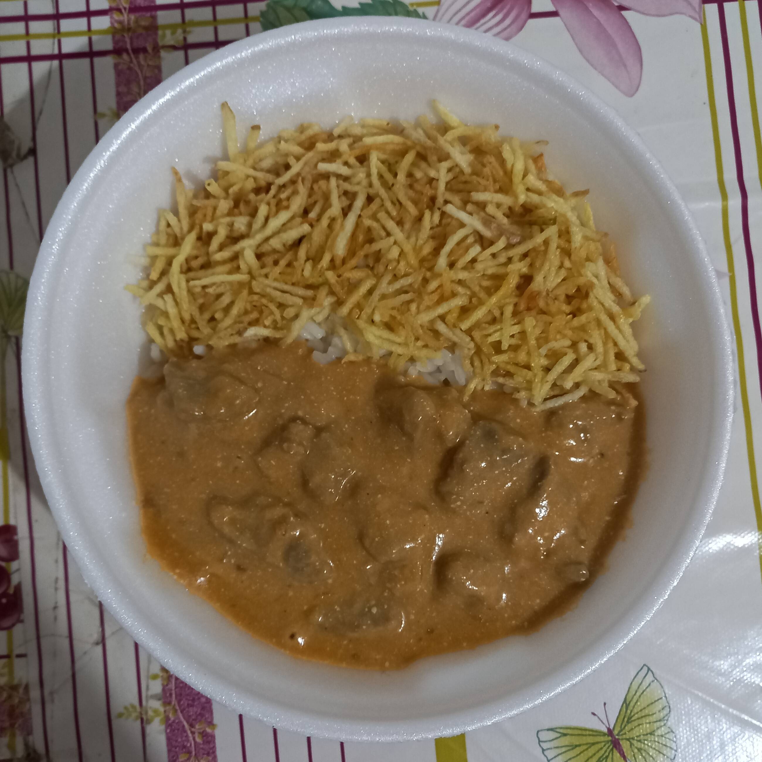 arroz branco, com iscas de frango grelhado, no molho p/ strogonoff com pedaços de champignon e uma deliciosa batata palha sequinha e crocante.