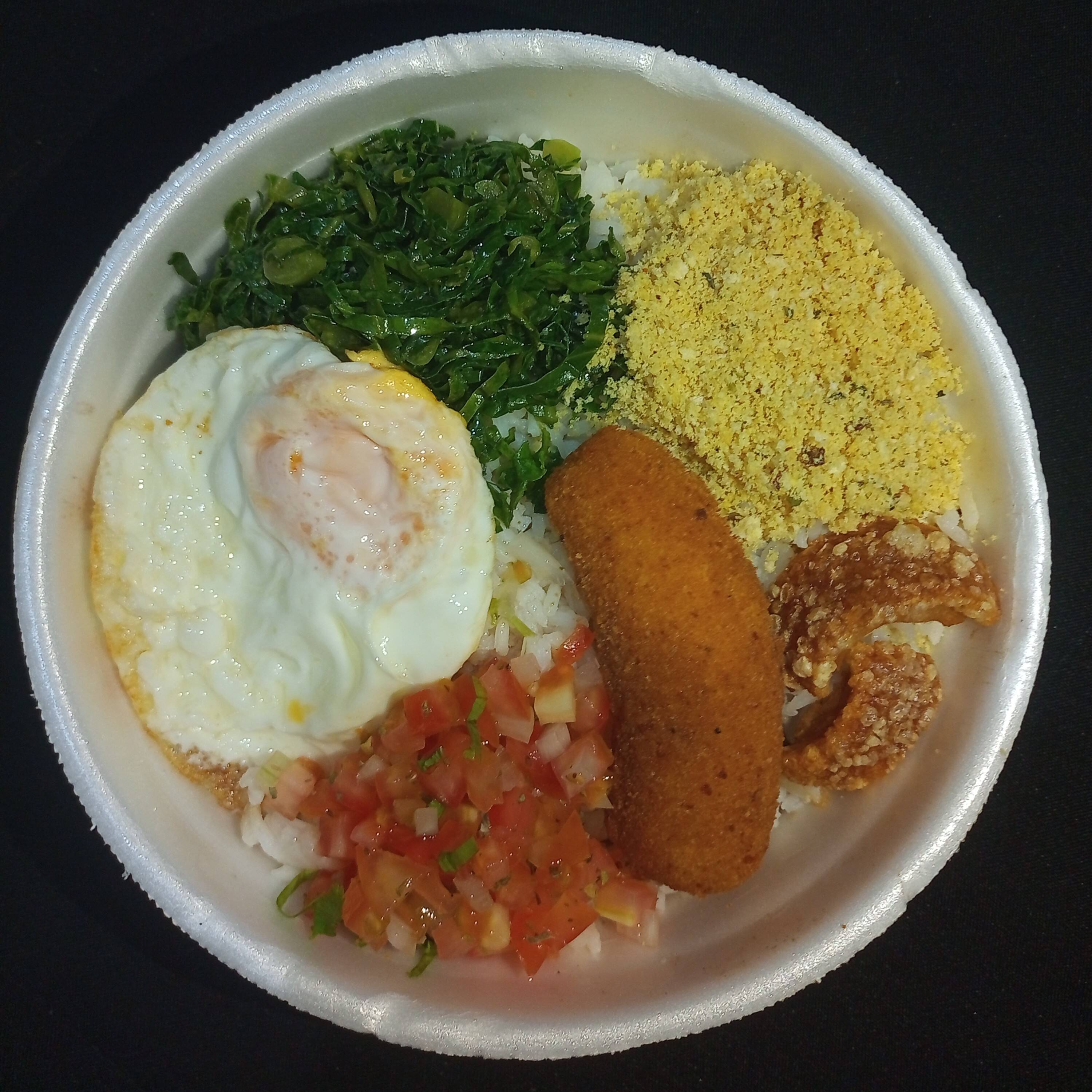arroz bramco e feijao preto c/ pertences acompanha ovo frito banana torresmo couve refogado farofa e vinagrete
