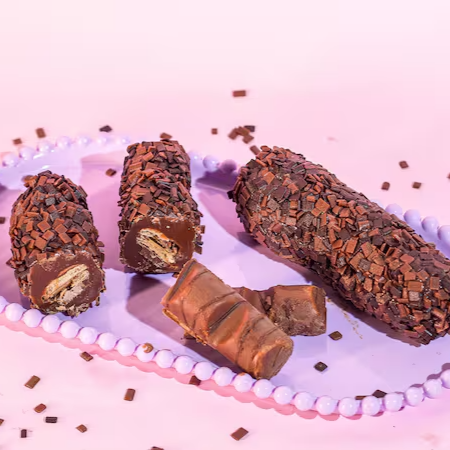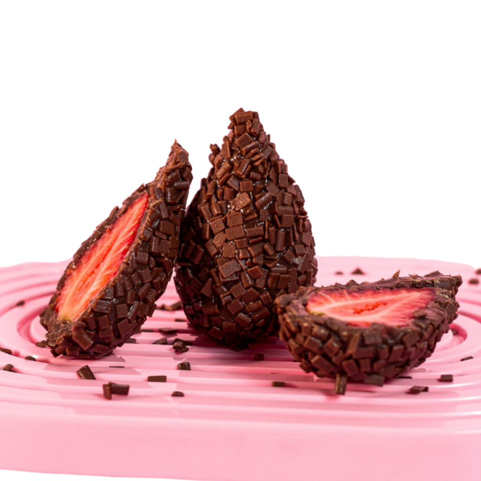 Nossa coxinha é feita com um delicioso brigadeiro ao leite, coberto com granulados ao leite e recheada com morango fresco e suculento. A combinação perfeita entre o doce intenso do chocolate e a refrescância da fruta