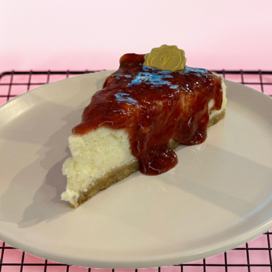 Base crocante de biscoito amanteigado, cheesecake cremoso e suave, finalizado com geleia artesanal de morangos frescos. Equilíbrio perfeito entre doçura, acidez e muito afeto em cada fatia.