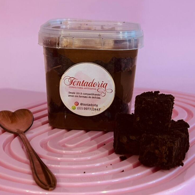 Uma explosão de sabor do começo ao fim: brownie úmido e intenso, intercalado com um creme de chocolate sedoso, seguido por uma generosa camada de brigadeiro caseiro. Finalizamos com granulado ao leite para aquele toque clássico que derrete na boca. É impossível provar só uma colherada — essa delícia foi feita para conquistar!