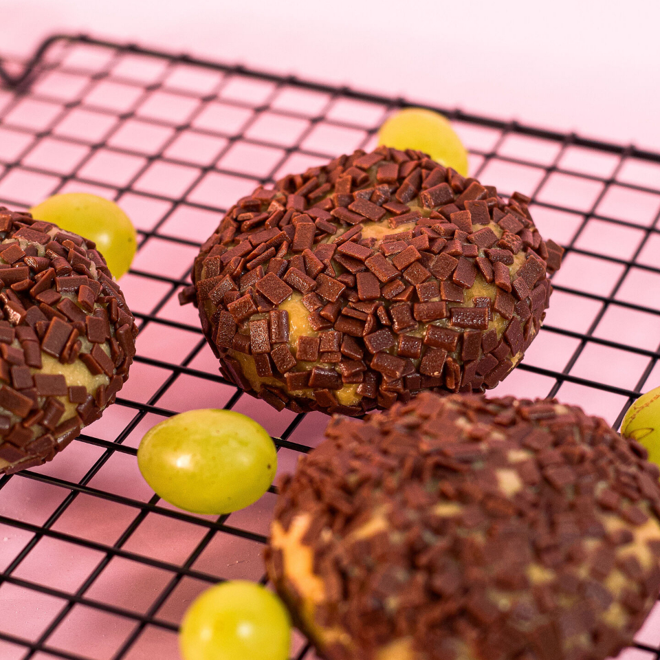Delicioso Brigadeiro de Ninho, recheado com Uvas Verdes, envolto de Granulado ao Leite. **Produto para consumo imediato, contém fruta fresca.