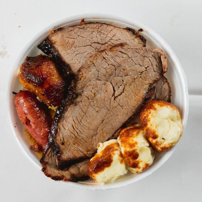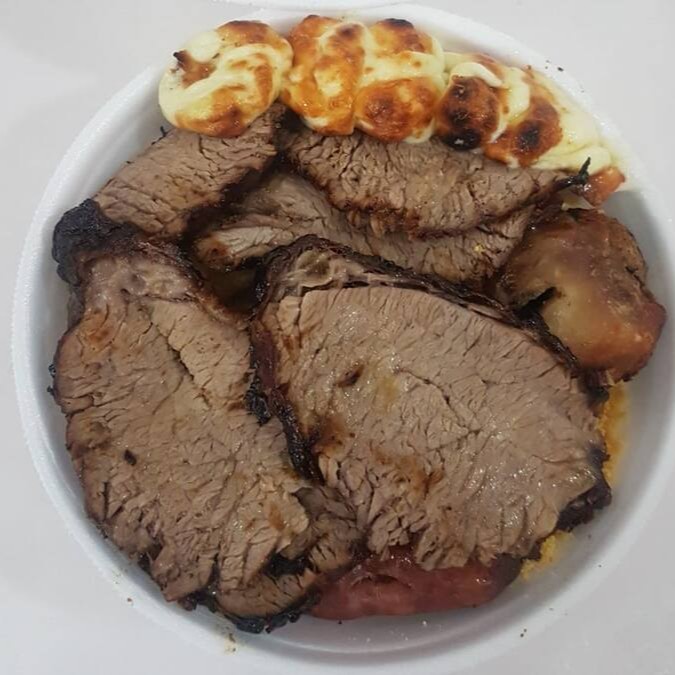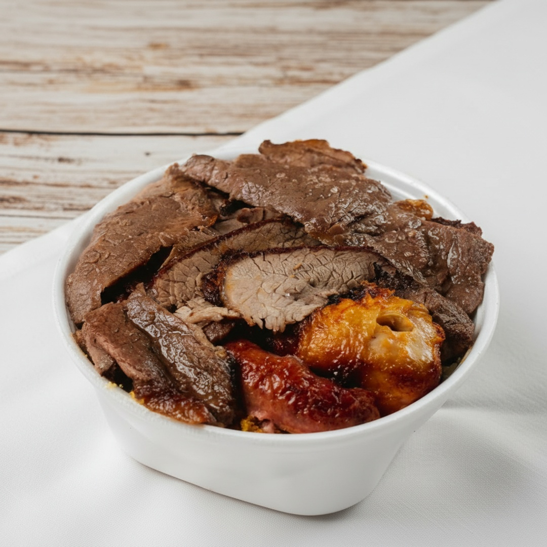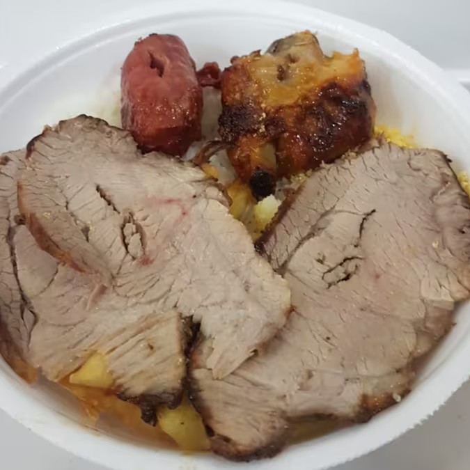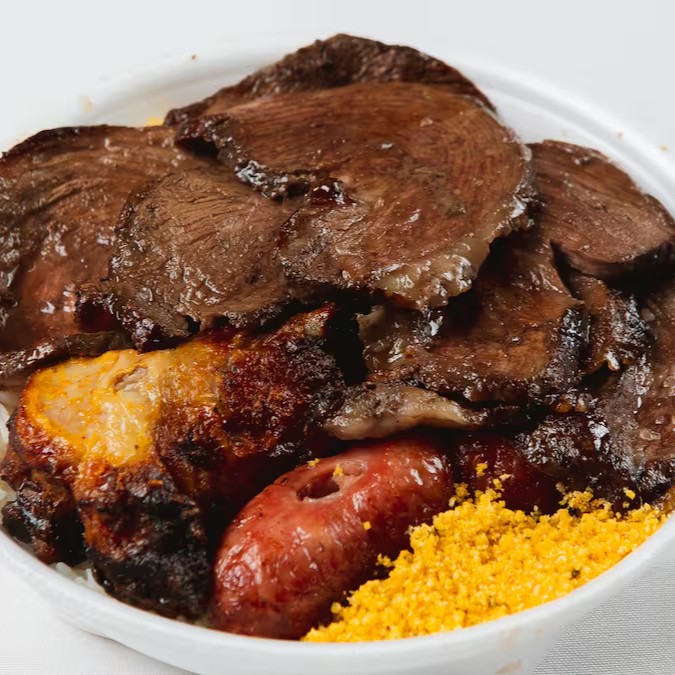 Acompanha: Arroz, Feijão Carioca, farofa, fritas, 1 frango, 1 linguiça e 2 fatias de maminha.
