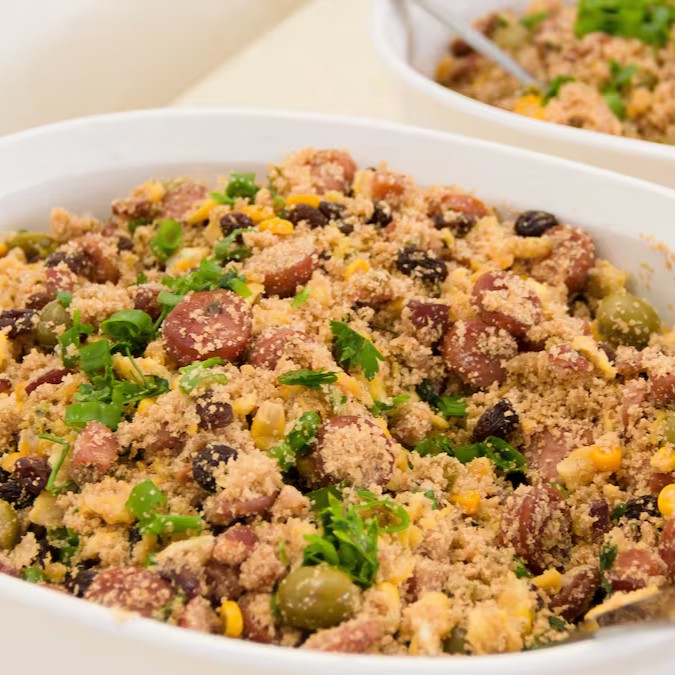 Arroz, feijão carioca, farofa, fritas, coxa de frango, linguiça e carne.