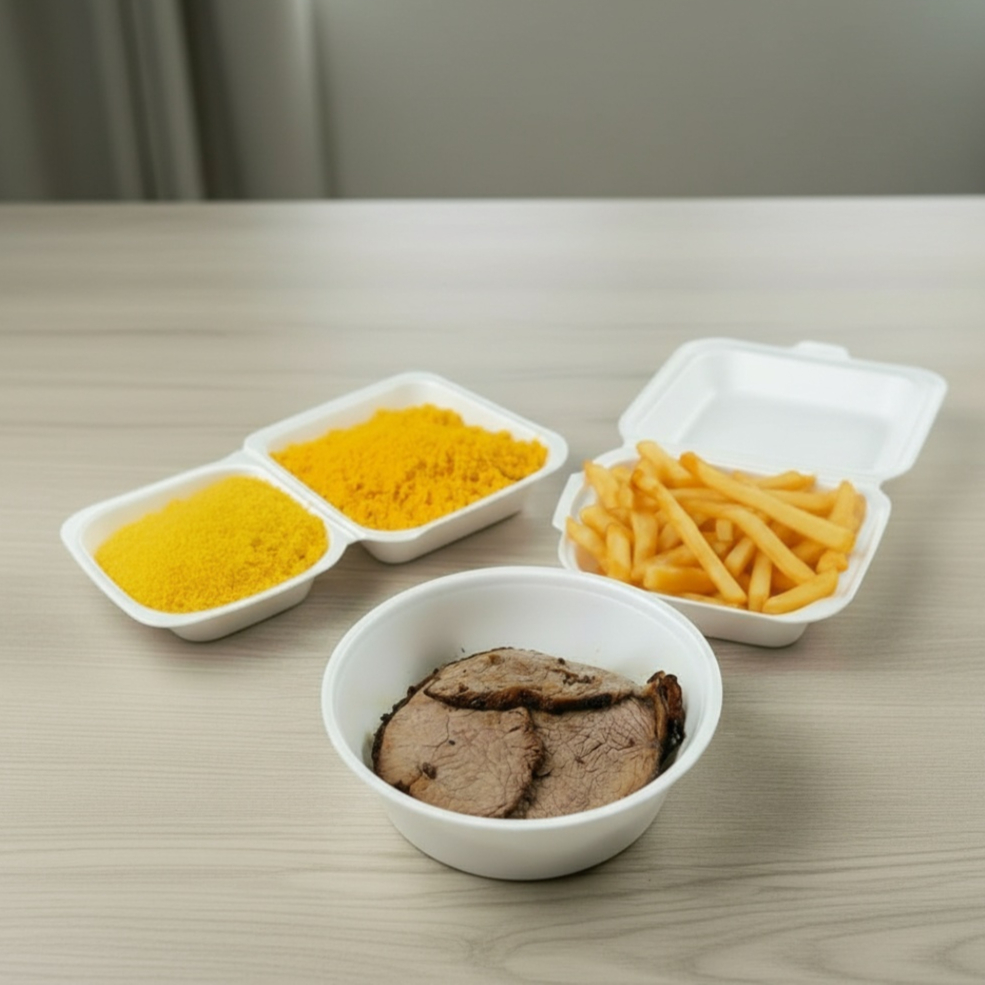 Marmitex pequena (750g). Arroz, feijão, farofa, fritas, carne, coxa de frango e queijo.