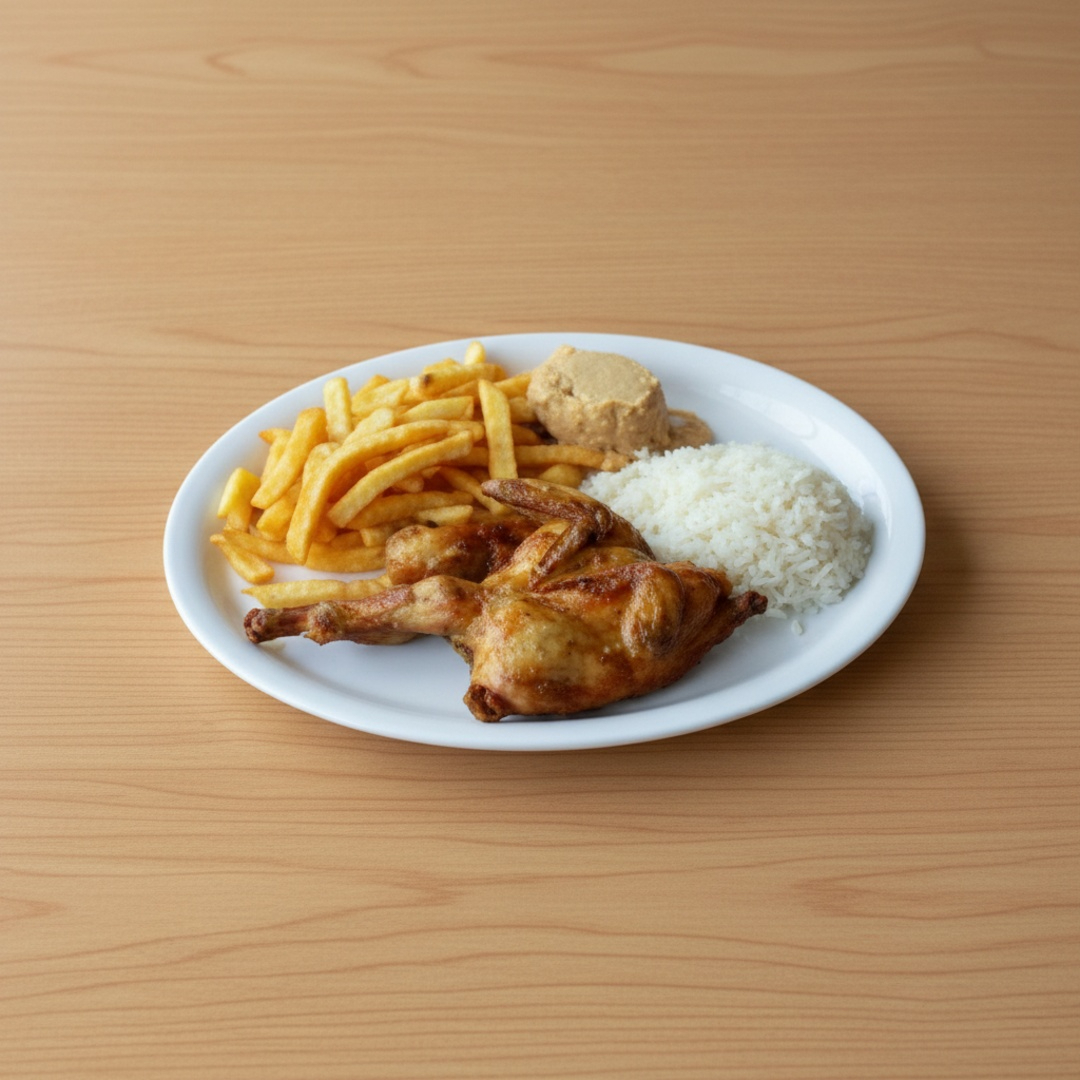 Arroz, Feijão, Farofa, Fritas e coxa de Frango
