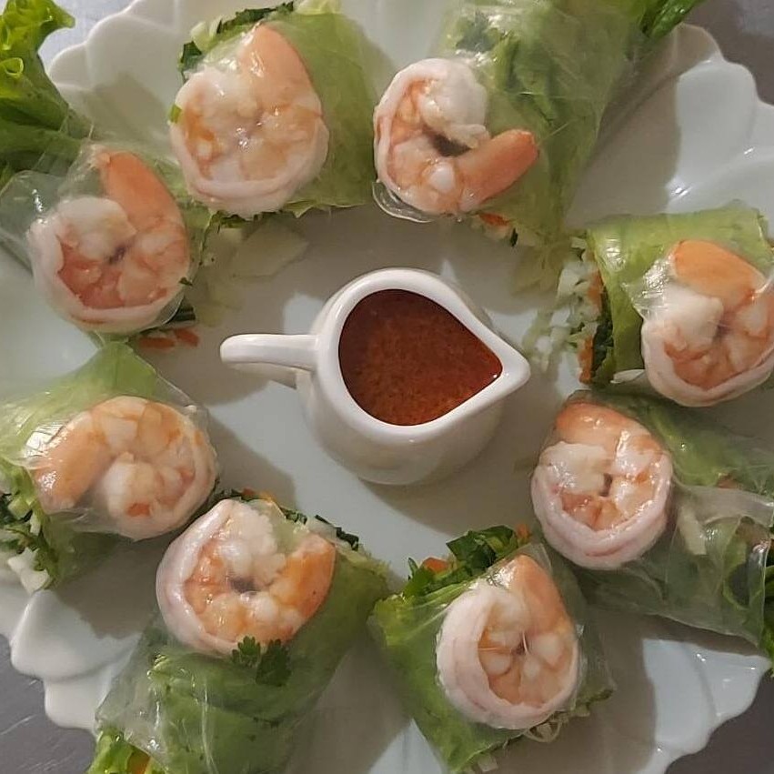 Rolinhos de papel de arroz com camarão ,pepino, coentro, hortelã ,alface, repolho e cenoura com molho de amendoim (8 unidades