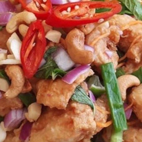 Peixe frito, Hortelã, limão, cebola roxa, gengibre, alho, cenoura, caju alérgico: contém caju.