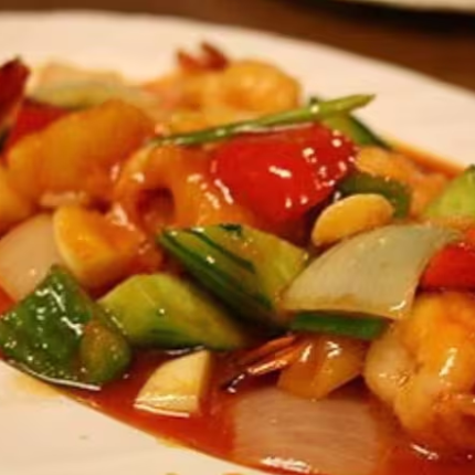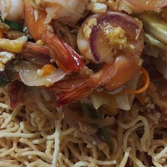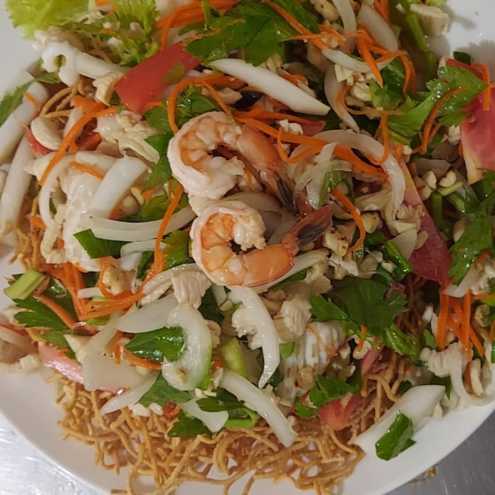 Macarrão crocante, camarão, lula, molho especial, frango picado, tomate, cenoura, cebola, salsão e amendoim