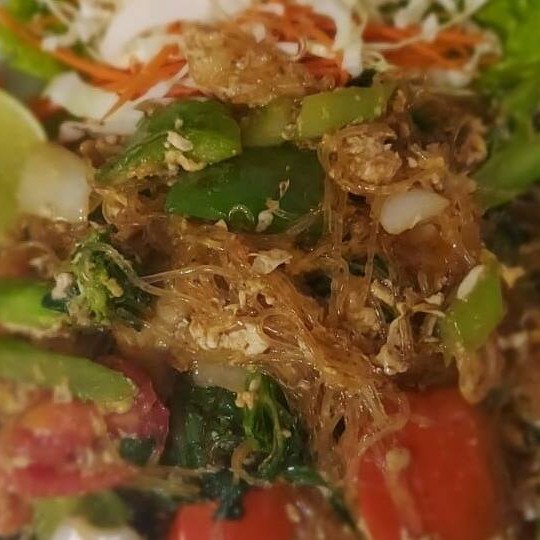 Macarrão crocante,tofu,molho especial tailandês, brotos de feijão, cenoura, repolho, cebola roxa, cebolinha e ovos