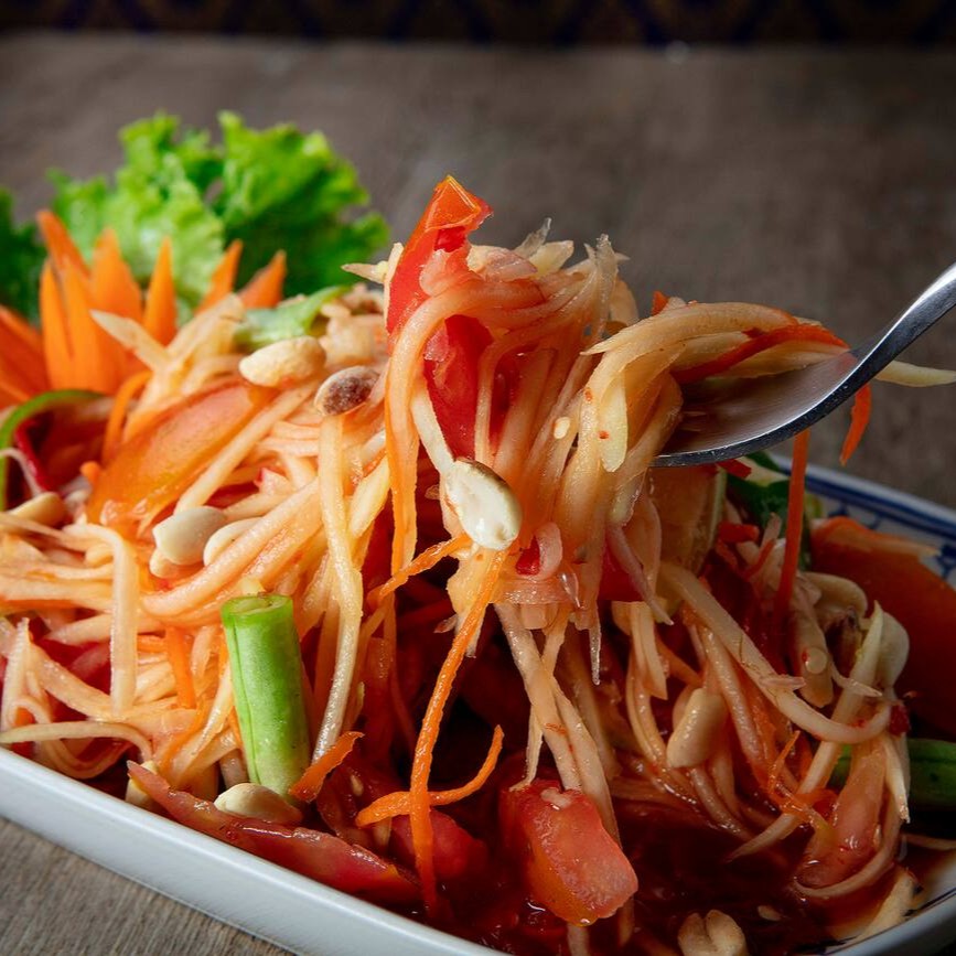 Mamão verde,amendoim torrado, tomates, vagem, aho e molho especial. alérgico: contém amendoim