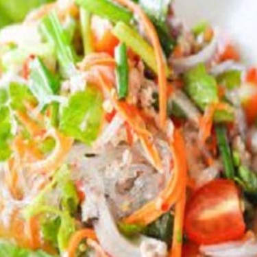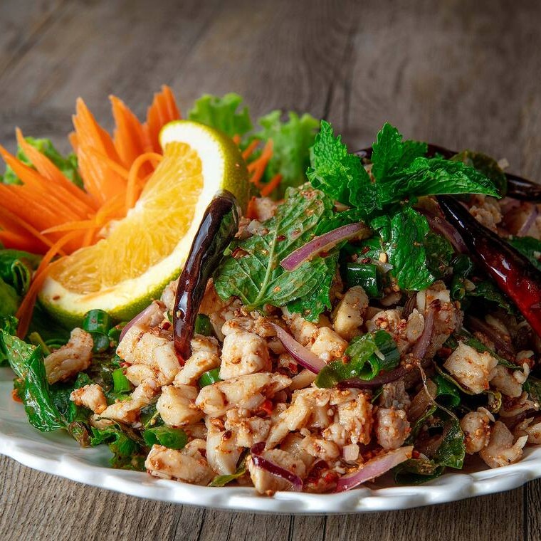 Frango picado,cebola roxa, hortelã, coentro, cebolinha, galangal, folha de limão-kaffir, molho de peixe e limão