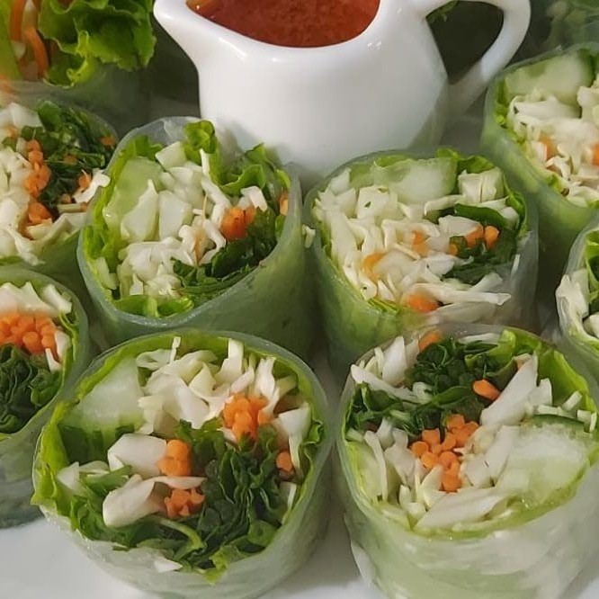 Rolinhos de papel de arroz com pepino, cenoura, coentro, hortelã, repolho e alface servido com molho de amendoim. Alérgico: contém amendoim