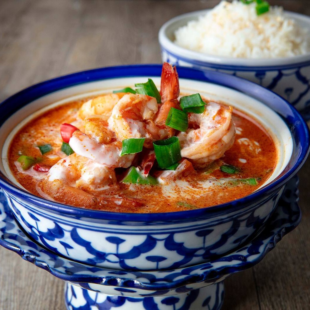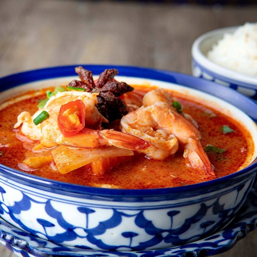 Galangal,folhas de limão-kaffir,pimenta fresca, shimeji,repolho,tomate,cebola,cebolinha,coentro e creme de leite. Acompanhamento com arroz. Observação: sopa apimentada.