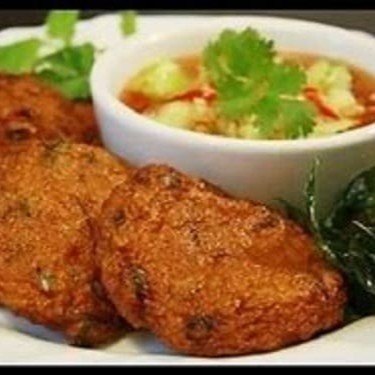 Bolinho de peixe frito temperado com curry vermelho, vagem, folha de limão, kaffir e levente apimentado. (6 unidades). Alérgico: contém pimenta.