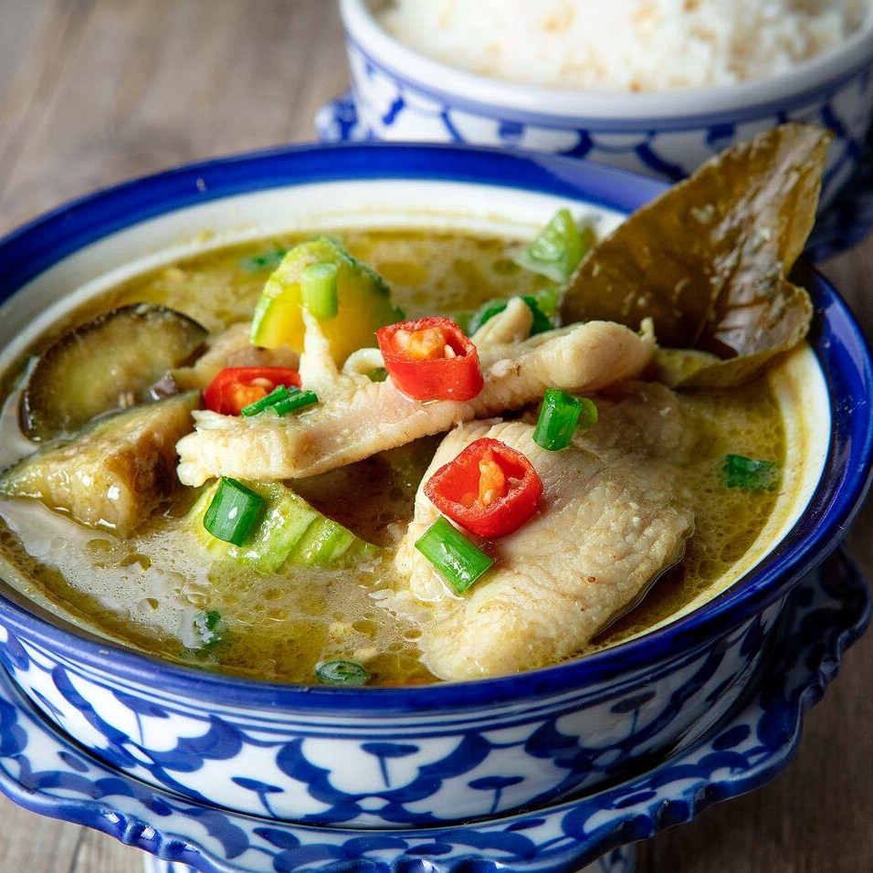 Pasta de curry verde, leite de coco, abobrinha, beringela, cebolinha e pimentão Acompanhamento com arroz. Observação: curry apimentado