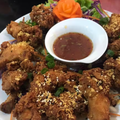 Frango temperado com molho tailandês, servido com molho agridoce de pimenta.