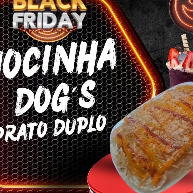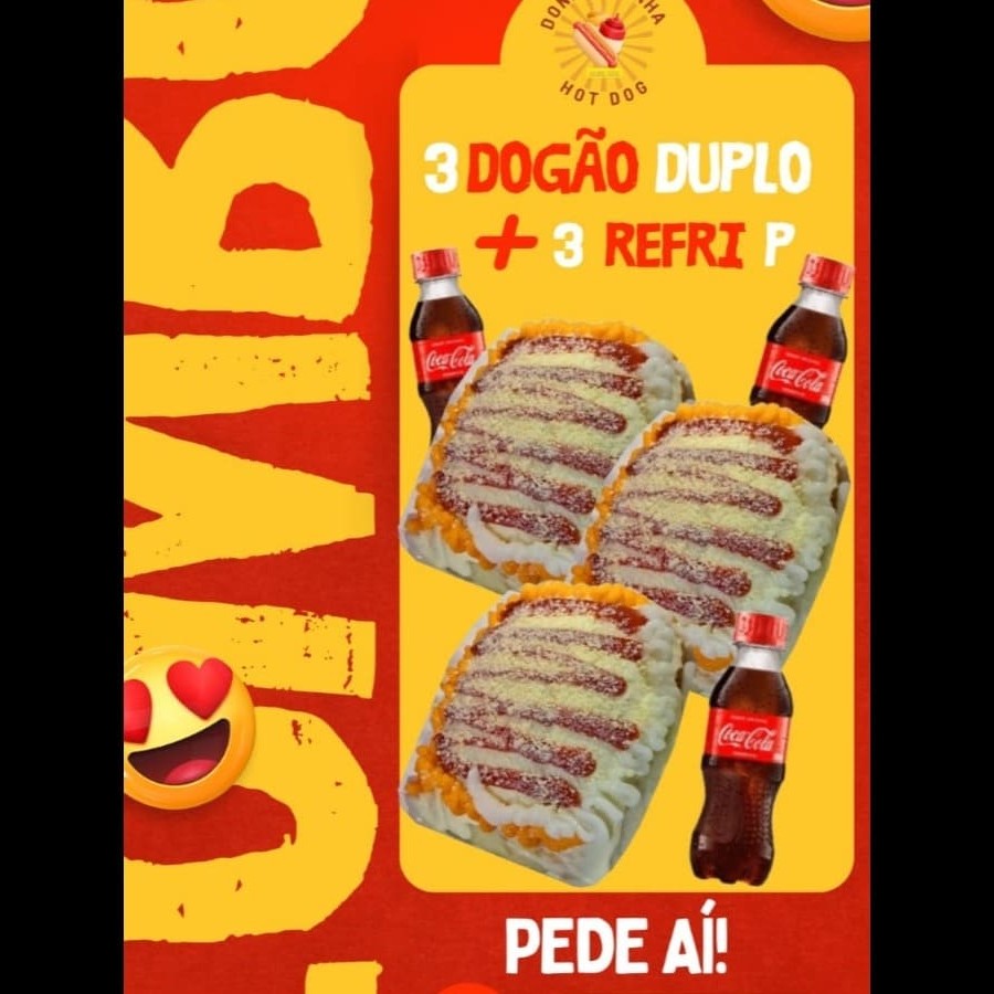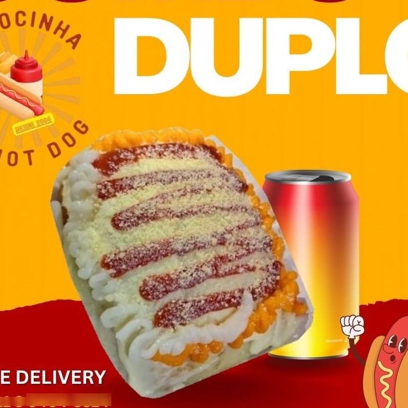 1 Dogão Duplo =1 Pão de banha, 1 Salsichas, Vinagrete, Repolho, Batata palha, Purê, Maionese, Ketchup, Mostarda, Cheddar, Catupiry e Queijo ralado + 1 Refrigerante 350ml + Açái 250ml