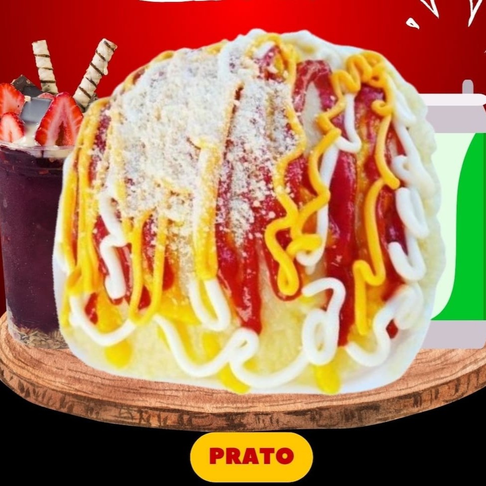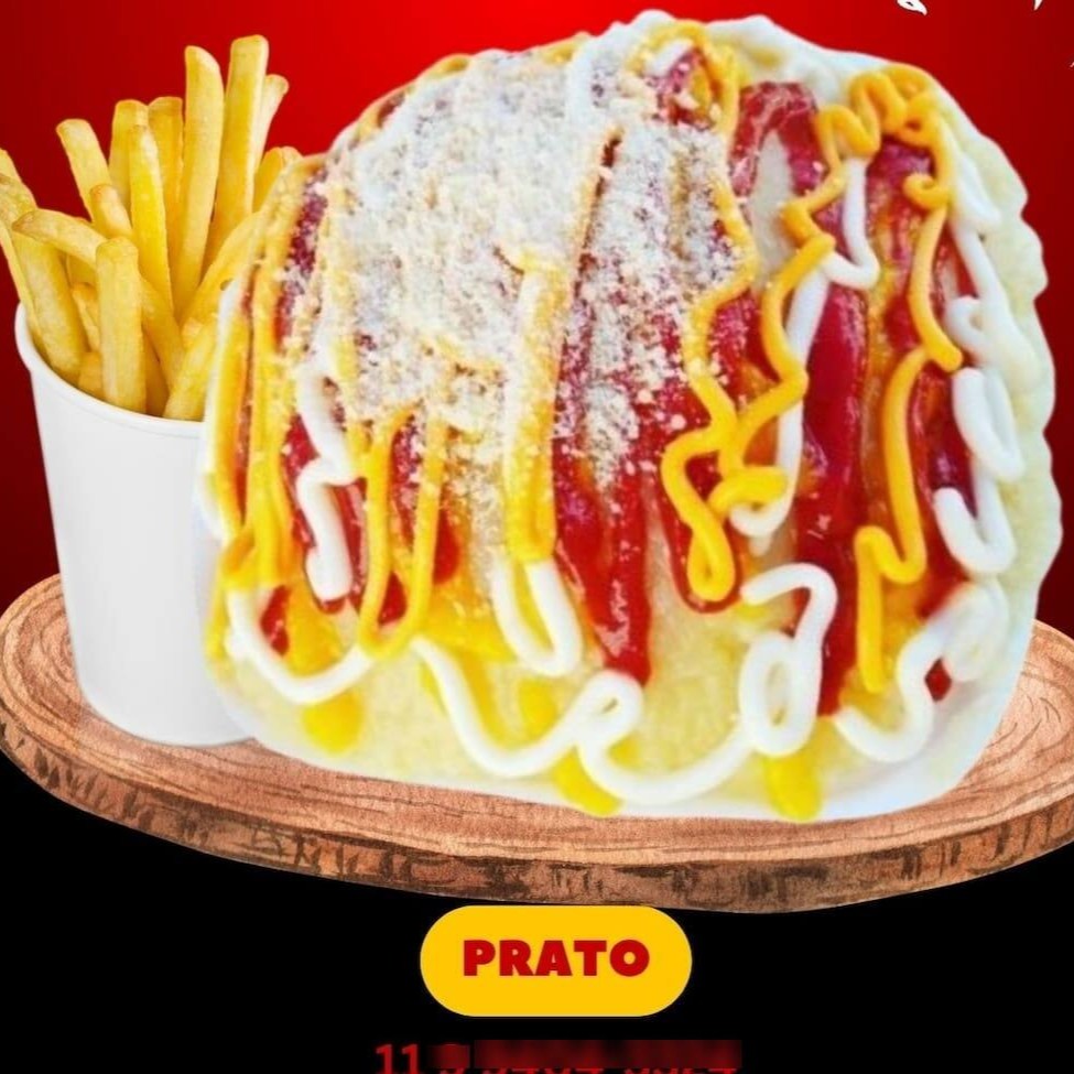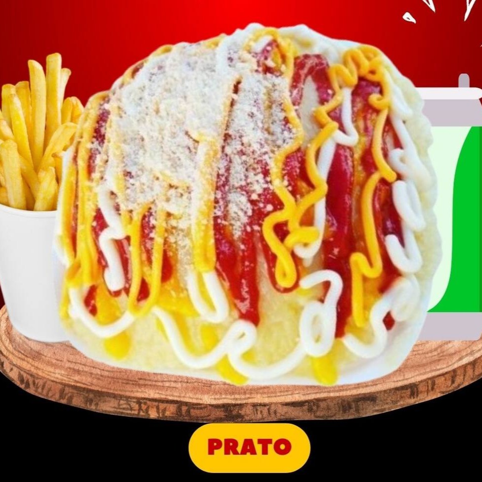 Pão de banha,4 salsichas, vinagrete, repolho, batata palha, purê, maionese,Katchup, mostarda, cheddar,Catupiry, queijo ralado e mais uma camada de batata palha + Batata Fritas P