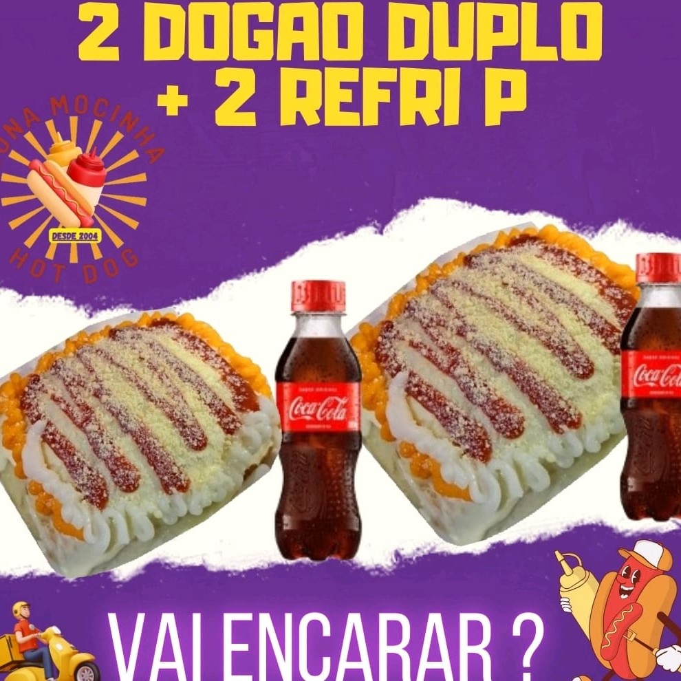 2 Dogão Duplo = 1 Pão de banha, 2 Salsichas, Vinagrete, Repolho, Batata palha, Purê, Maionese, Ketchup, Mostarda, Cheddar, Catupiry e Queijo ralado + 2 Porçaão Nuggts P + 2 Refrigerante 350ml